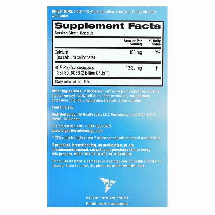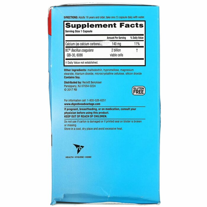 Только Digestive Advantage использует BC30, уникальный запатентованный пробиотик. Натуральная белковая оболочка защищает наш пробиотик, позволяя ему выжить в желудочной кислоте, так что попасть в ваш пищеварительный тракт и достичь кишечника, где бактерии вам больше всего нужны, может большее их количество. Пробиотики в кишечнике способствуют здоровью пищеварительной и иммунной системы.