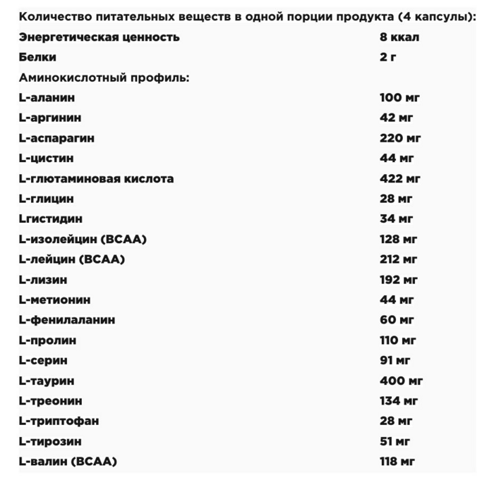 Разовая порция-4 капс. Принимайте по 1-2 порции 2-6 раз в сутки между приёмами пищи и сразу после тренировки.