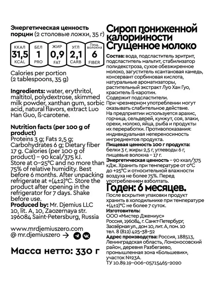 Mr. Djemius Сироп низкокалорийный ZERO Сгущённое молоко, 330 мл