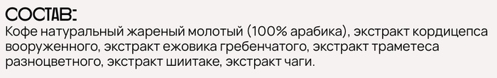 Идеальный баланс насыщенного вкуса 100% арабики и пользы пяти функциональных грибов в привычной чашке кофе. Не нужно менять привычки, просто замените обычный кофе на SHROOM COFFEE.Яркий вкус с нотами темного шоколада, орехов и темных ягод и карамели. Длительное бархатистое послевкусие с легкой горчинкой.СУПЕРГЕРОИ:ЕЖОВИК помогает сконцентрироваться, усиливает внимание и активизирует память, КОРДИЦЕПС дарит энергию и бодрость, ЧАГА является мощным антиоксидантом, укрепляет иммунитет и защищает организм от свободных радикалов, ТРАМЕТЕС поддерживает иммунную систему и способствует общему оздоровлению организма, ШИИТАКЕ улучшает общее самочувствие и поддерживает иммунитет