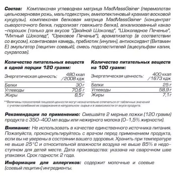 Siberian Nutrogunz Гейнер MadMassGainer Фисташка, 2000 г — это высокоэффективный гейнер, созданный для тех, кто стремится к набору мышечной массы и увеличению силы. Этот продукт сочетает в себе оптимальное соотношение белков, углеводов и жиров, обеспечивая организм необходимыми питательными веществами для быстрого восстановления и роста мышц.Преимущества и свойства:Высокое содержание белка:Обеспечивает организм качественным строительным материалом для мышц, способствуя их росту и восстановлению после интенсивных тренировок.Энергетическая поддержка:Углеводы в составе гейнера обеспечивают длительное поступление энергии, необходимой для продуктивных тренировок и активного образа жизни.Восстановление и рост:Сбалансированная формула способствует быстрому восстановлению мышц и увеличению их объема, что особенно важно для спортсменов и бодибилдеров.Уникальный вкус:Фисташковый аромат и вкус делают прием гейнера приятным и разнообразным, что способствует регулярному использованию продукта.Поддержка иммунитета:Витамины и минералы в составе укрепляют иммунную систему, помогая организму справляться с физическими нагрузками и стрессом.Особенности:Гейнер MadMassGainer от Siberian Nutrogunz отличается высокой биодоступностью компонентов и тщательно подобранной формулой, которая подходит как для профессиональных спортсменов, так и для любителей. Продукт не содержит искусственных красителей и консервантов, что делает его безопасным и полезным для здоровья.Условия хранения:Храните продукт в сухом, прохладном месте, защищенном от прямых солнечных лучей. После вскрытия упаковки рекомендуется использовать продукт в течение 3 месяцев для сохранения его свежести и эффективности. Закрывайте упаковку плотно после каждого использования, чтобы избежать попадания влаги и посторонних запахов.О бренде Siberian Nutrogunz:Siberian Nutrogunz это бренд, предлагающий продукцию для поддержания здоровья и укрепления иммунной системы. С использованием натуральных ингредиентов и строгого контроля качества, Siberian Nutrogunz создает продукты, которые помогают людям поддерживать баланс здоровья и достигать своих жизненных целей. Более 10 лет Siberian Nutrogunz помогает людям по всему миру поддерживать здоровье и активность.
