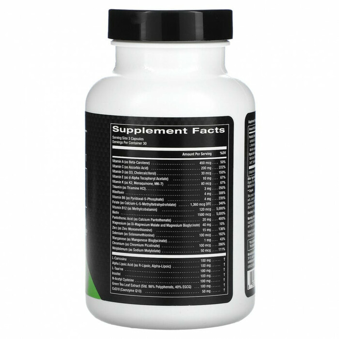 Витамин A (в виде бета-каротина) (1500 МЕ) 450 мкг RAE, Витамин С (в виде аскорбиновой кислоты) 200 мг, Витамин D3 (в виде холекальциферола) (1200 МЕ) 30 мкг, Витамин E (d-альфа токоферилацетат) (15 МЕ) 10 мг, Витамин К2 (в виде менахинона, МК-7) 80 мкг, Тиамин (в виде тиамина гидрохлорида) 3 мг, Рибофлавин 4 мг, Витамин B6 (пиридоксаль-5-фосфат) 4 мг, Фолат (в виде кальций-L-5-метилтетрагидрофолата) 1360 мкг фолиевого эквивалента (800 мкг фолиевой кислоты), Витамин В12 (в виде метилкобаламина) 120 мкг, Биотин 1500 мкг, Пантотеновая кислота (в виде пантотената кальция) 20 мг, Магний (в виде димагния малата и бисглицината магния) 40 мг, Цинк (в виде монометионина) 15 мг, Селен (в виде селенометионина) 100 мкг, Марганец (в виде бисглицината) 1 мг, Хром (в виде пиколината) 100 мкг, Молибден (в виде молибдата натрия) 50 мкг, Калий (в виде цитрата) 25 мг, L-карнозин 100 мг, Альфа-липоевая кислота (альфа-липоевая кислота и R-липоевая кислота) 100 мг, L-таурин 100 мг, Инозитол 100 мг, N-ацетил цистеин 100 мг, Зеленый чай (стандартизированный до 98% полифенолов, 40% ЭГКГ) 100 мг, CoQ10 (коэнзим Q10) 50 мг, Смесь пробиотиков (3 млн жизнеспособных клеток), фруктоолигосахариды (FOS), lactobacillus acidophilus, L. plantarum, L. casei, L. bulgaricus, L.brevis, L. rhamnosus, L. lactis, Bifidobacterium lactis, B. bifidum, L.sporogenes (B. coagulans), Streptococcus thermophilus 50 мг. Органическая смесь для поддержки цельного питания во время соблюдения кетодиеты. Клетчатка зеленой свеклы, корень свеклы, шпинат, семена сельдерея, кориандр, листья одуванчика, корень одуванчика, листья орегано, листья петрушки, спирулина 50 мг.