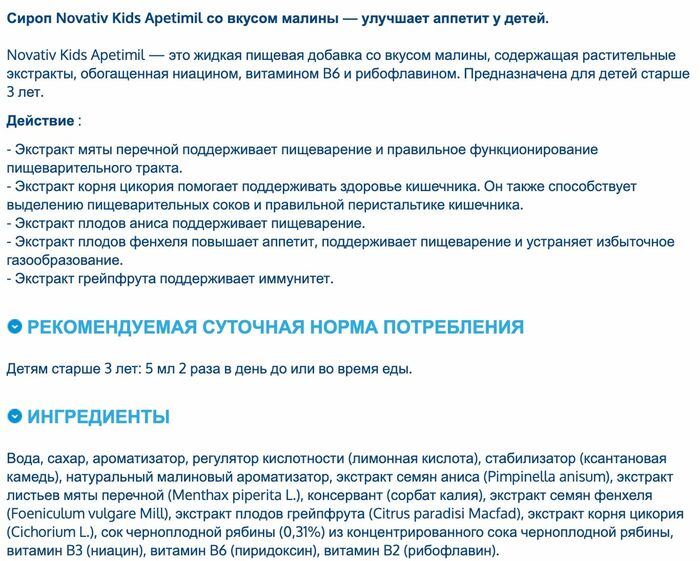 Сироп Novativ Kids подходит для детей старше 3 лет и может использоваться в периоды, когда аппетит снижен из-за болезни или стресса. Он легко смешивается с другими продуктами, что позволяет добавлять его в любимые блюда.