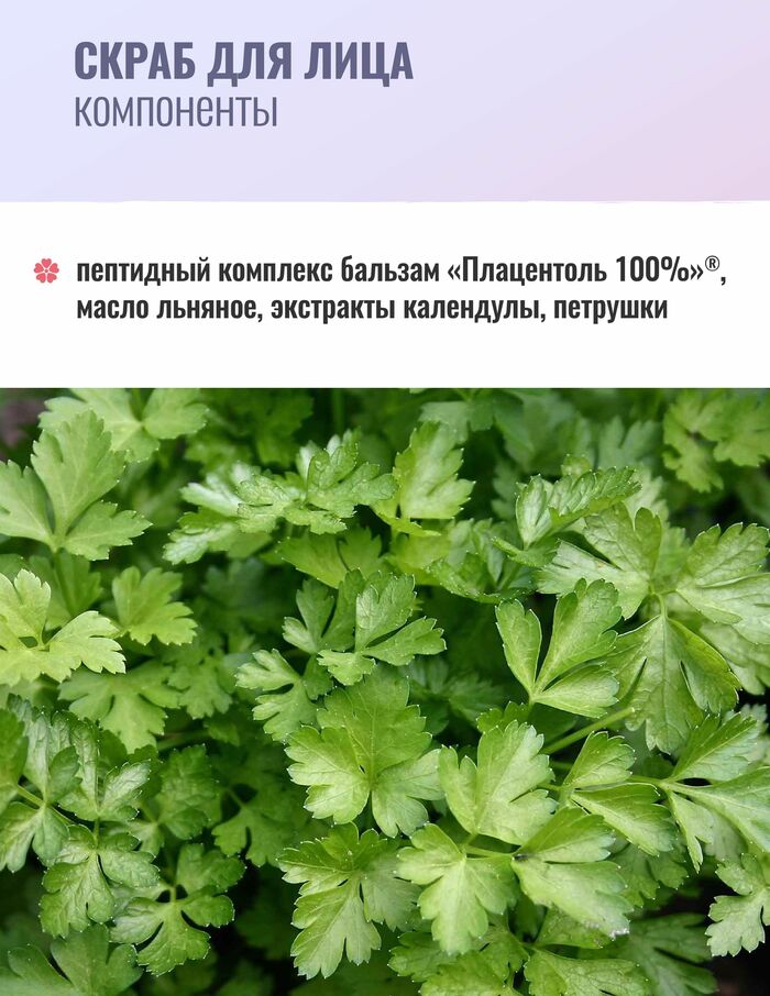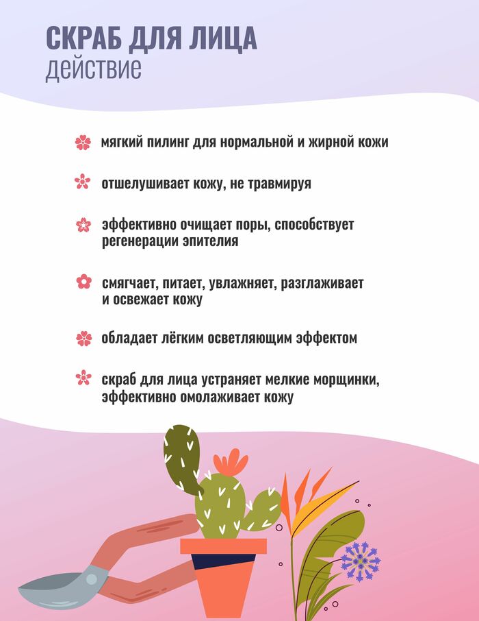 Скраб для лица - мягкий пилинг для нормальной и жирной кожи. Отшелушивает ороговевшие частички кожного покрова, не травмируя его, эффективно очищает поры кожи, способствует регенерации эпителия.Смягчает, питает, увлажняет, разглаживает кожу и освежает её. Чистка лица в домашних условиях обладает лёгким осветляющим эффектом. Благодаря высокому содержанию биологически активных веществ, в том числе коэнзима молодости Q10, скраб для лица устраняет мелкие морщинки, эффективно омолаживает кожу.