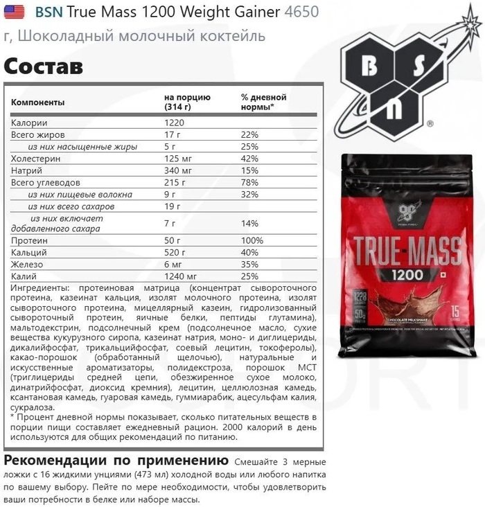 BSN Гейнер True-Mass 1200 Шоколад, 4650 г