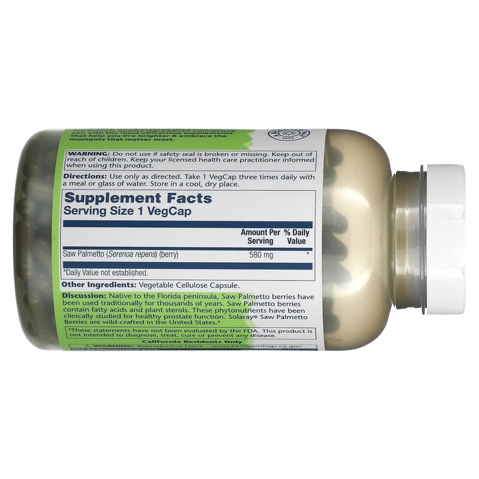 Описание. Ягоды серенои, растущие на полуострове Флорида, традиционно использовались в течение тысяч лет. Они содержат жирные кислоты и фитостерольные эфиры. Эти фитонутриенты прошли клинические исследования для здоровой работы предстательной железы. Ягоды серенои от Solaray® добыты в диких условиях в США.