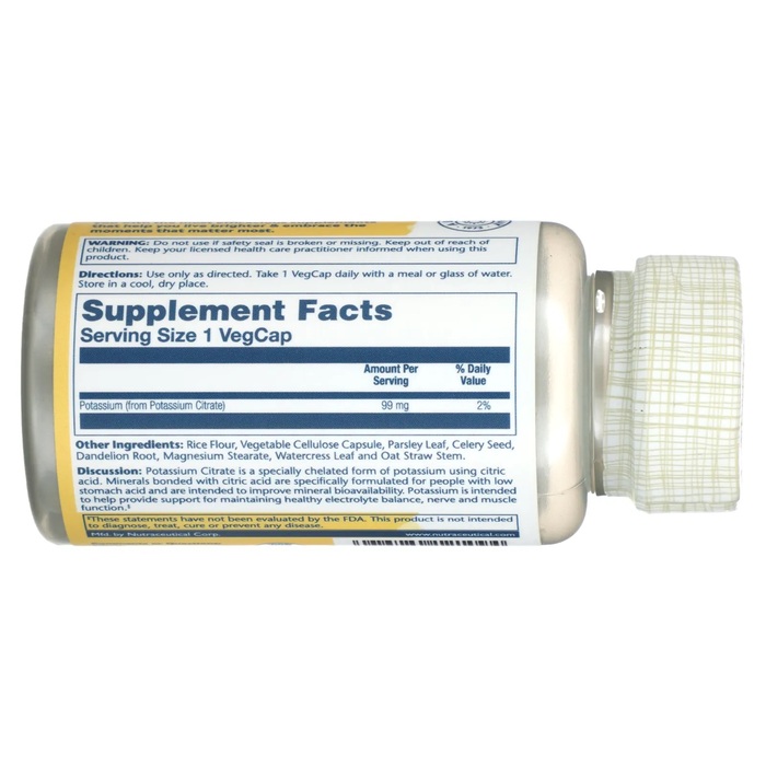 Описание. Цитрат калия - это специально хелатная форма калия, в которой используется лимонная кислота. Минералы, связанные с лимонной кислотой, специально разработаны для людей с пониженной кислотностью желудка и предназначены для повышения биодоступности минералов. Калий способствует поддержанию здорового электролитного баланса, работе нервной и мышечной систем.