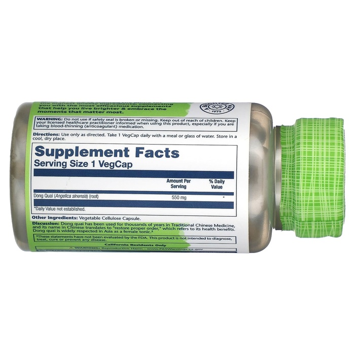 Solaray Экстракт корня Донг Куай — это удобная добавка для женщин, ищущих натуральное средство для улучшения здоровья и баланса в организме. Продукт не содержит искусственных добавок и подходит для долгосрочного использования, обеспечивая комплексную поддержку женского здоровья и благополучия.