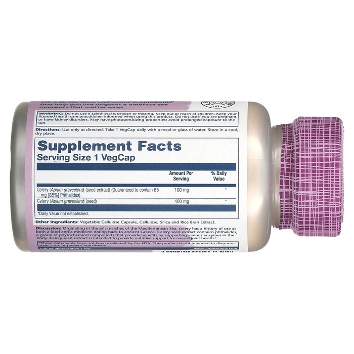 Описание. Сельдерей, произрастающий в солончаках Средиземного моря, используется в пищу и в качестве лекарства еще в Древней Греции. Экстракт семян сельдерея содержит фталиды - группу фитохимических соединений, которые оказывают положительное воздействие, поддерживая различные ферменты в организме. Экстракт семян сельдерея обеспечивает питательную поддержку для общего здоровья суставов.