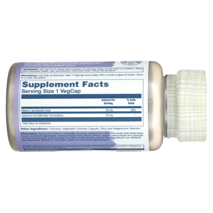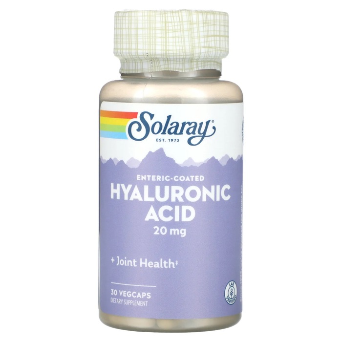 Гиалуроновая кислота - это натуральное соединение, которое помогает поддерживать смазку тканей и суставов. Гиалуроновая кислота Solaray® имеет кишечнорастворимое покрытие, которое помогает капсулам выдерживать кислотность желудка и проходить в тонкий кишечник, где ингредиенты высвобождаются и всасываются. Для улучшения усвоения в состав добавлен витамин C.