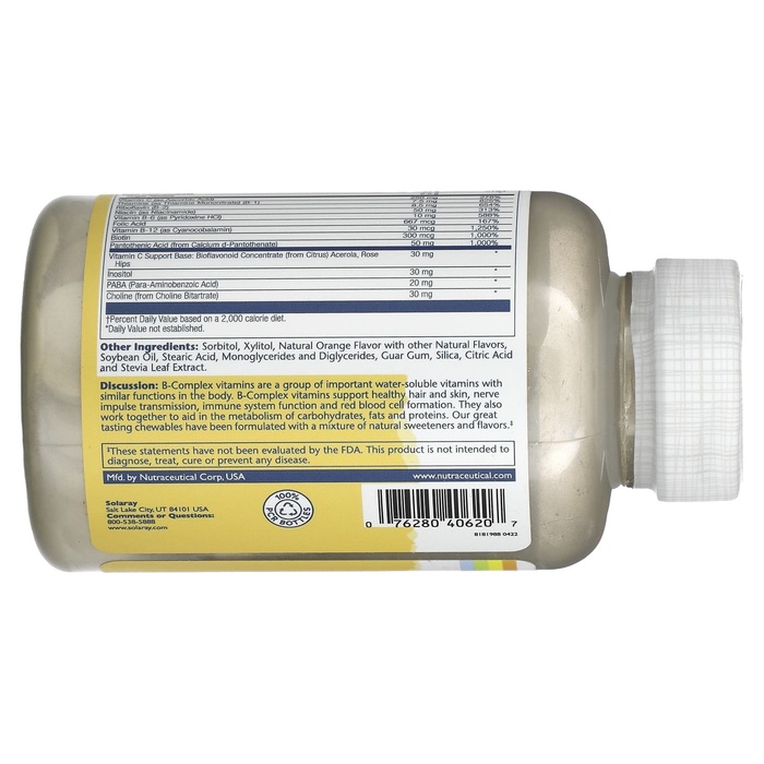 Описание. Комплекс витаминов группы B — это группа важных водорастворимых витаминов со схожими функциями в организме. Комплекс витаминов группы B обеспечивает питательную поддержку для здоровья волос и кожи, передачу нервных импульсов, функцию иммунной системы и образование эритроцитов. Кроме того, они работают вместе, способствуя метаболизму углеводов, жиров и белков. Наши жевательные таблетки с прекрасным вкусом содержат натуральные подсластители и ароматизаторы.