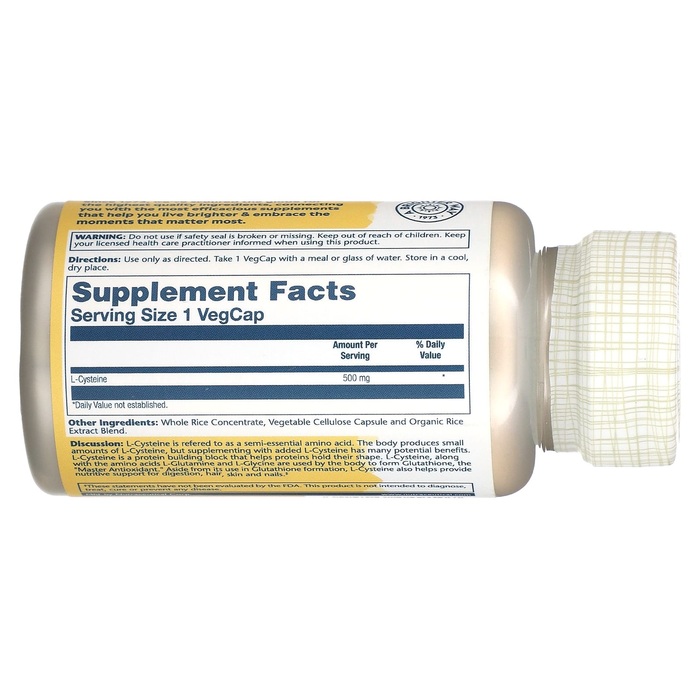 Аминокислота L-Цистеин (500 мг) от Solaray — это мощная добавка, предназначенная для поддержки различных аспектов здоровья и благополучия. L-цистеин является полузаменимой аминокислотой, играющей критическую роль в образовании белков и поддержании их структуры. Каждая капсула содержит 500 мг лабораторно подтвержденного L-цистеина, что помогает белкам сохранять свою форму и функцию.