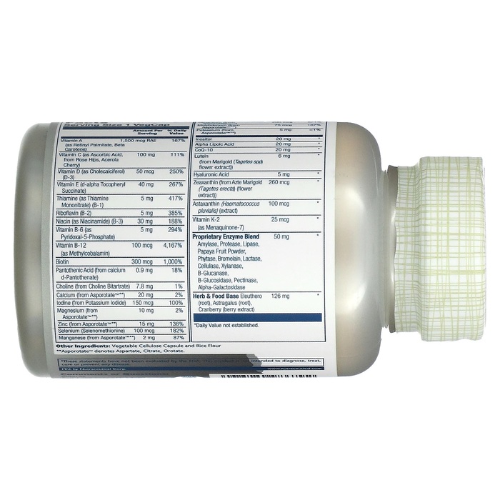 Solaray OD Adult 50+ Multi — это специально разработанная мультивитаминная формула для взрослых старше 50 лет, учитывающая особые потребности организма в этом возрасте. Продукт включает в себя тщательно подобранные витамины и минералы, которые способствуют поддержанию здоровья костей, сердца и иммунной системы. В состав входят такие важные компоненты, как витамины D, B12 и фолиевая кислота, которые помогают поддерживать здоровье костей и иммунной системы, а также антиоксиданты, такие как витамин C и экстракт зеленого чая, которые защищают клетки от повреждений.