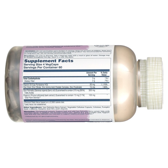 Экстракты коры африканской сливы и ягод дикой пальмы сереноя содержат жирные кислоты и фитостеролы, которые, согласно клиническим испытаниям, поддерживают здоровую функцию простаты. Кроме того, эта формула содержит цинк, витамин B-6, тыквенное семя и аминокислоты для улучшенной алиментарной поддержки.