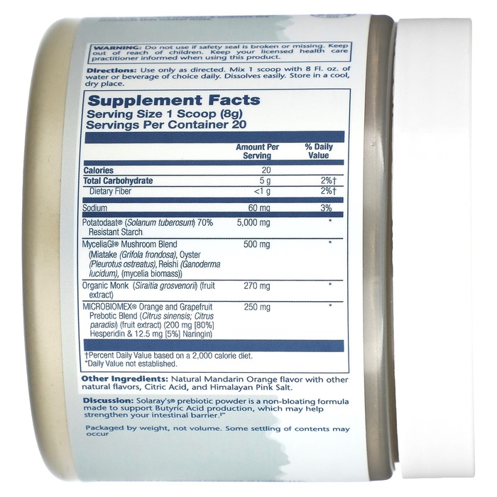Описание. Пребиотический порошок Solaray's® не вызывает вздутия живота и поддерживает выработку масляной кислоты, которая может способствовать укреплению кишечного барьера **.