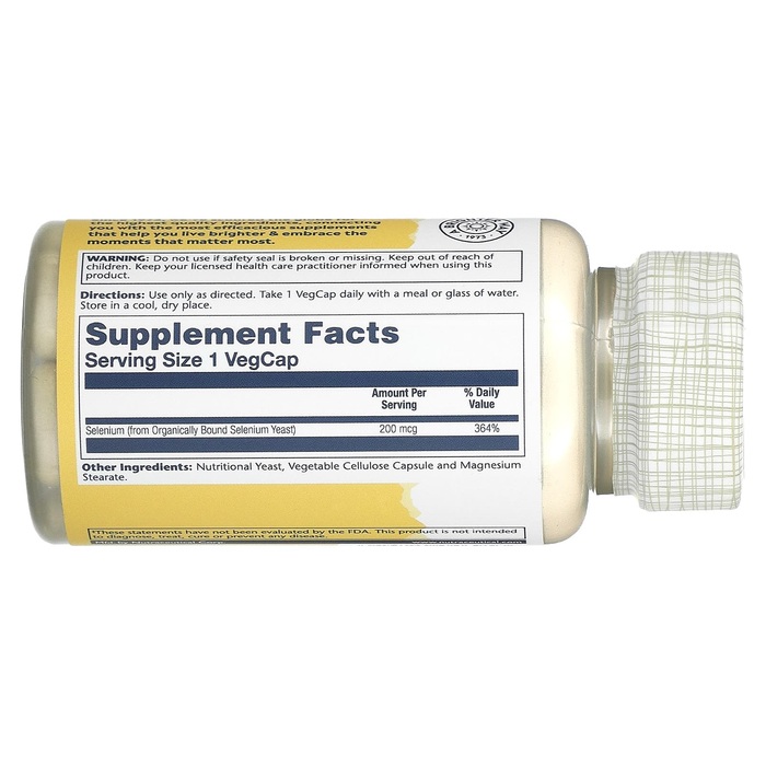 Solaray Селен - это высококачественная добавка, содержащая органическую форму селена, важного микроэлемента, который играет ключевую роль в поддержании здоровья организма. Селен известен своими антиоксидантными свойствами и помогает защитить клетки от повреждений, вызванных свободными радикалами. Он также способствует нормализации работы иммунной системы и поддерживает функции щитовидной железы.
