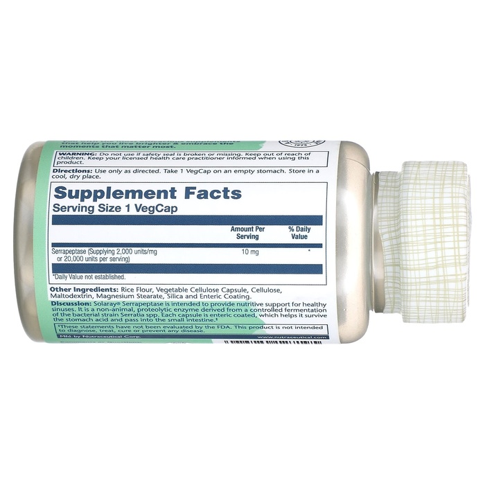 Discussion: Solaray® Serrapeptase is intended to provide nutritive support for healthy sinuses. It is a non-animal, proteolytic enzyme derived from a controlled fermentation of the bacterial strain Serratia spp. Each capsule is enteric coated, which helps it survive the stomach acid and pass into the small intestine.