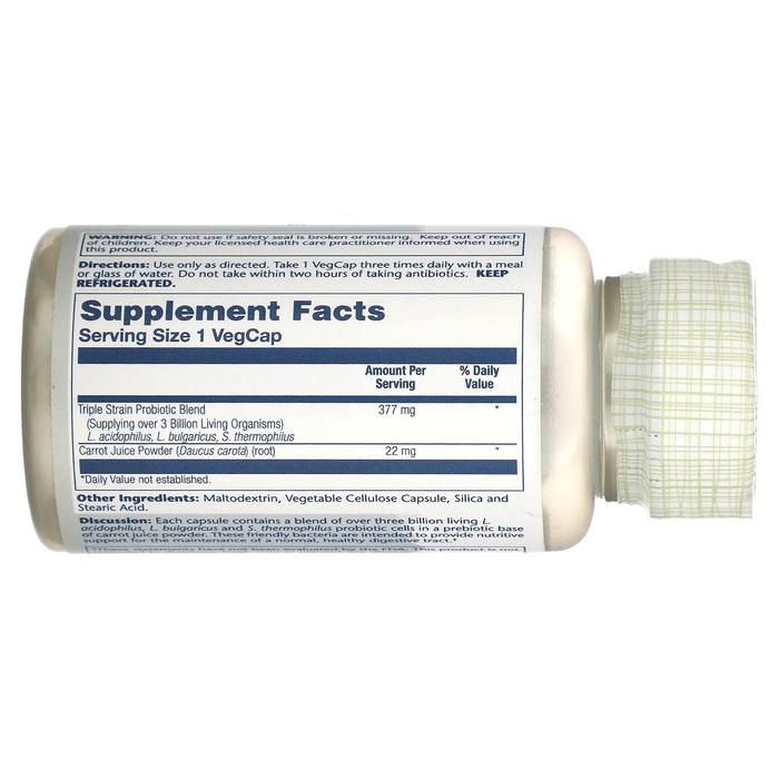 Описание. Каждая капсула содержит смесь более трех миллиардов живых пробиотических клеток L. acidophilus, L. bulgaricus и S. thermophilus на пребиотической основе в виде порошка из морковного сока. Эти полезные бактерии обеспечивают питательную поддержку для поддержания нормального и здорового пищеварительного тракта.