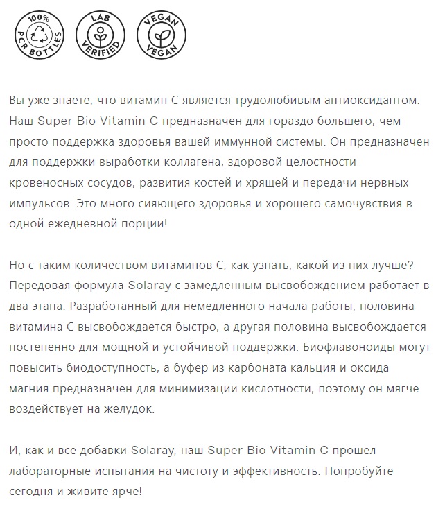 Solaray Супер Био Витамин С представлен в удобных капсулах, и упаковка на 60 капсул обеспечивает длительный курс приема. Каждая капсула содержит 1000 мг витамина C, что делает добавку эффективной для людей, которые хотят укрепить иммунитет, улучшить состояние кожи и поддержать общий уровень здоровья на высоком уровне.