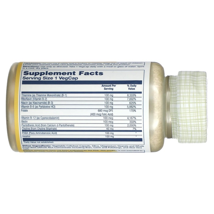 Solaray Комплекс витаминов группы B 100, 50 веганских капсул — это мощная формула, созданная для поддержки вашего здоровья и повышения уровня энергии. Этот комплекс витаминов группы B помогает улучшить метаболизм, поддерживает нервную систему и способствует общему благополучию организма.Преимущества и свойства:Энергетическая поддержка:Витамины группы B играют ключевую роль в преобразовании пищи в энергию, что помогает поддерживать высокий уровень активности и выносливости.Здоровье нервной системы:Комплекс способствует нормальному функционированию нервной системы, улучшая когнитивные функции и снижая уровень стресса.Улучшение метаболизма:Витамины B1, B2, B3, B5, B6, B7, B9 и B12 способствуют нормализации обменных процессов, что важно для поддержания здорового веса и общего самочувствия.Поддержка иммунитета:Витамины группы B укрепляют иммунную систему, помогая организму эффективно бороться с инфекциями и заболеваниями.Веганская формула:Продукт не содержит ингредиентов животного происхождения, что делает его идеальным выбором для веганов и вегетарианцев.Особенности:Solaray Комплекс витаминов группы B 100 отличается высокой биодоступностью и чистотой ингредиентов. Продукт разработан для людей, стремящихся поддерживать активный образ жизни и заботиться о своем здоровье. Каждая капсула содержит оптимальные дозировки витаминов группы B, обеспечивая максимальную пользу для организма.Условия хранения:Храните продукт в сухом, прохладном месте, вдали от прямых солнечных лучей и источников тепла. Держите в недоступном для детей месте, чтобы избежать случайного употребления.О бренде Solaray:Solaray это бренд, предлагающий натуральные добавки и продукты для здоровья. С использованием высококачественного сырья и строгого контроля качества, Solaray создает продукты, которые помогают людям поддерживать здоровье и достигать своих жизненных целей. Более 50 лет Solaray помогает людям по всему миру поддерживать здоровье и активность.;