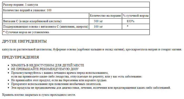 Solaray Витамин C с шиповником и ацеролой (500 мг), 100 капсул