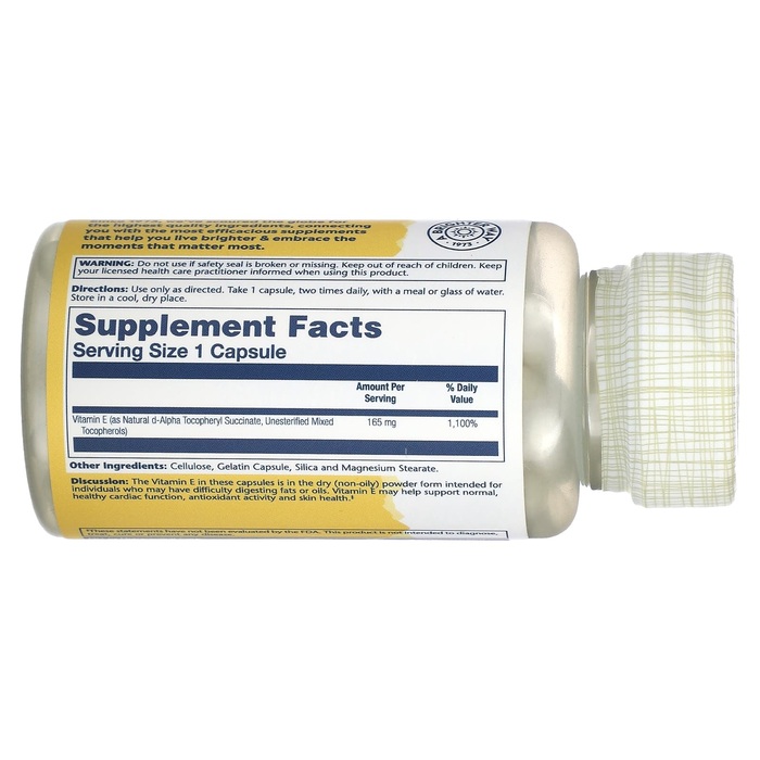 Описание. Витамин Е в этих капсулах находится в форме сухого (немасляного) порошка, предназначенного для людей, которые могут испытывать трудности с перевариванием жиров или масел. Витамин E может поддерживать нормальную работу сердца, антиоксидантную активность и здоровье кожи.