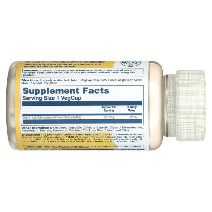 Витамин K2 менахинон-7 премиального качества, содержащийся в этой формуле, получен из нута. Менахинон-7, как известно, имеет более длительный период полураспада, чем другие формы витамина К, и поэтому считается, что он обладает уникальными преимуществами для организма. Он помогает поддерживать здоровье сердечно-сосудистой системы, формирование костей и сосудов.