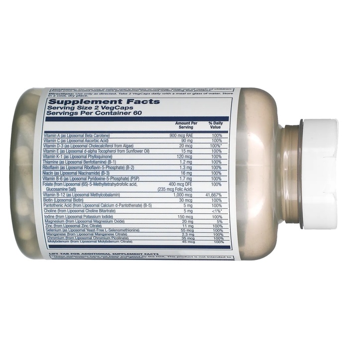 Целлюлоза, липидная смесь из подсолнечного масла и экологически чистого пальмового масла, капсула из растительной целлюлозы, стеариновая кислота, модифицированный тапиоковый крахмал, стеарат магния, диоксид кремния, альгинат натрия, гороховый крахмал и аравийская камедь.