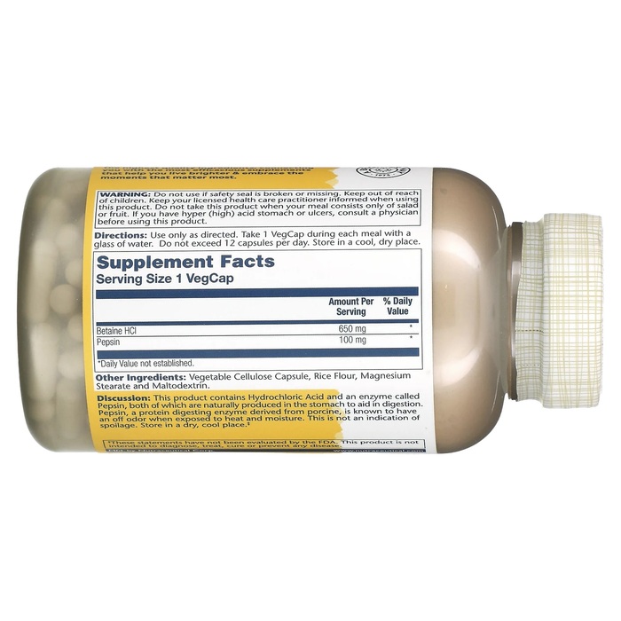 Solaray Высокоэффективный бетаина гидрохлорид с пепсином (650 мг), 250 капсул