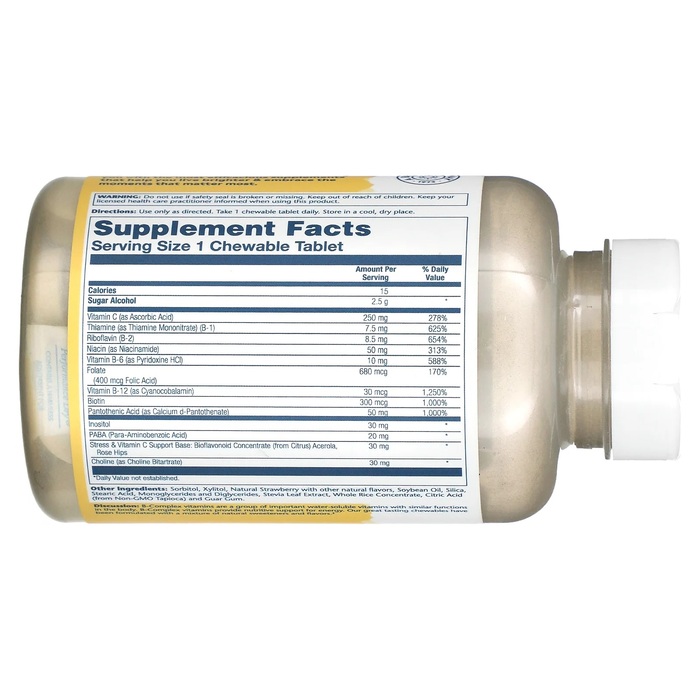 Описание. Комплекс витаминов группы B — это группа важных водорастворимых витаминов со схожими функциями в организме. Комплекс витаминов группы B обеспечивает питательную поддержку для здоровья волос и кожи, передачу нервных импульсов, функцию иммунной системы и образование эритроцитов. Кроме того, они работают вместе, способствуя метаболизму углеводов, жиров и белков. Этот продукт специально разработан для людей, подверженных стрессу. Наши жевательные таблетки с прекрасным вкусом содержат натуральные подсластители и ароматизаторы.