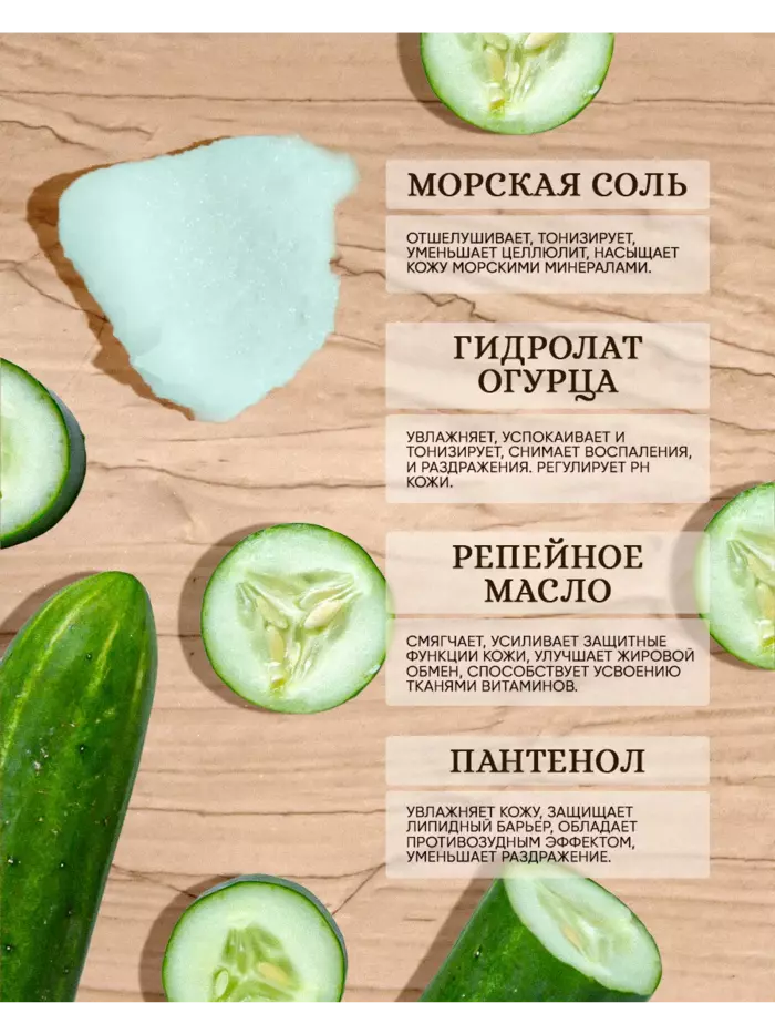 • Увлажнение и питание: Экстракт огурца увлажняет и питает кожу, делая её мягкой и гладкой.