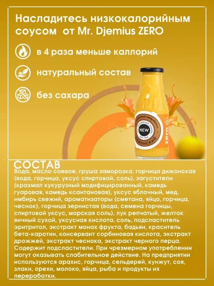 Mr. Djemius Низкокалорийный соус Дижонский отличается высоким качеством ингредиентов и тщательно продуманной рецептурой. Этот продукт создан для тех, кто ценит вкус и заботится о своем здоровье. Соус упакован в удобную бутылку объемом 330 г, что позволяет легко дозировать его количество.