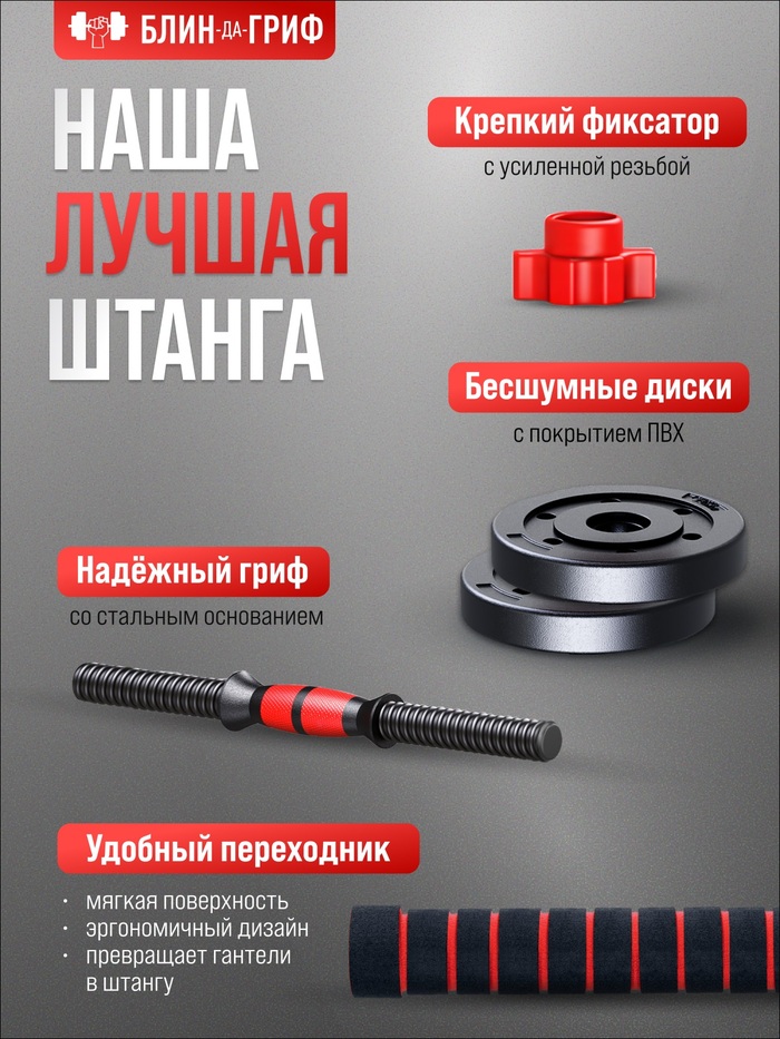 Спорт инвентарь- штанга разборная создана специально для силовых тренировок и спортивной атлетики. Диски покрыты ударопрочным гипоаллергенным пластиком, внутри которого цементный наполнитель. Спортивный снаряд такого плана не гремит, не царапает пол, занимает мало места и трансформируется в гантели. Штанга-трансформер с легкостью разбирается в 2 гантели. Лучшее, что можно делать для себя- это уделять время спорту, своему телу, и здоровью. Домашние тренировки становятся все популярнее, особенно с использованием гантелей. Для ежедневных тренировок предлагаем вам домашний тренировочный инвентарь- трансформер. Большой спортивный набор гантелей заменит вам полноценную тренировку в зале. В спортивный инвентарь входят 19 предметов. Гриф для штанги легкий и в то же время прочный - он состоит из стальной трубы 2мм длиной 40см, покрытой неопреновой оболочкой, что обеспечивает мягкость и прочность фиксации. В зависимости от набора, блины для гантелей позволяют собрать гантели разборные 15 кг; гантели разборные 40 кг; гантели 1 кг; гантели 2 кг; гантели 3 кг; гантели 4 кг; гантели 5 кг; гантели 10 кг. Аксессуары и инвентарь будут хорошим и полезным подарком на любой праздник. Силовая тренировка будет доставлять вам удовольствие. Гантели для фитнеса помогают укрепить тело; увеличить мускульную массу; привести мышцы в тонус и держать в форме. Гантели разборные 10 кг представляют собой идеальную альтернативу тренажерам, которые занимают много места и не всегда доступны в домашних условиях. Снаряд обеспечит необходимую тренировочную нагрузку и приведет к результатам, которые вы не можете достичь без их помощи. Гантели трансформер и штангу приятно и комфортно держать в руке, выполняя, например жим лежа. Гантели женские и мужские можно собрать любого веса, как для начинающих любителей, так и для опытных спортсменов. С таким фитнес-инвентарем можно развивать все группы мышц. Наши гантели идеально подходят для домашних тренировок и уличных тренировок. Фитнес; тяжелая атлетика в домашних условиях Вам обеспечен. Для фитнеса инвентарь можно использовать для укрепления всех групп мышц и выполнять упражнения на различные части тела: спину; плечи; грудь; трицепсы; бицепсы; ноги и т. д. Вы можете приобрести гантели для спорта разных весов себе или в подарок!