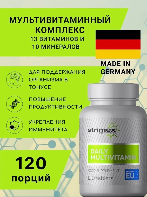 Мультивитамины Daily Vitamin от бренда Strimex — это идеальное решение для поддержания здоровья всей семьи. В каждой упаковке содержится 120 таблеток, которые обеспечат ваш организм необходимыми витаминами и минералами.