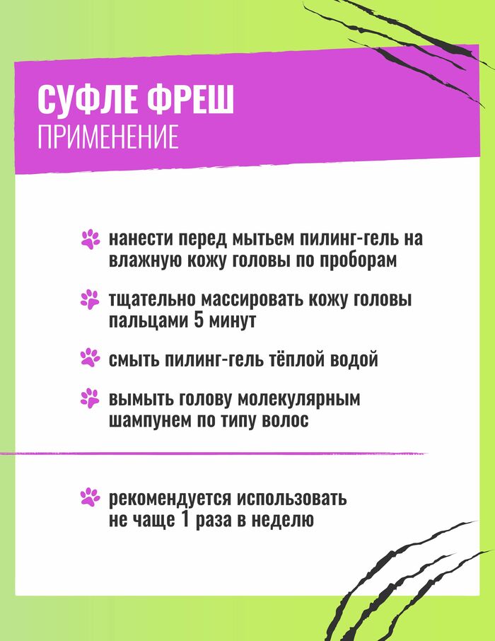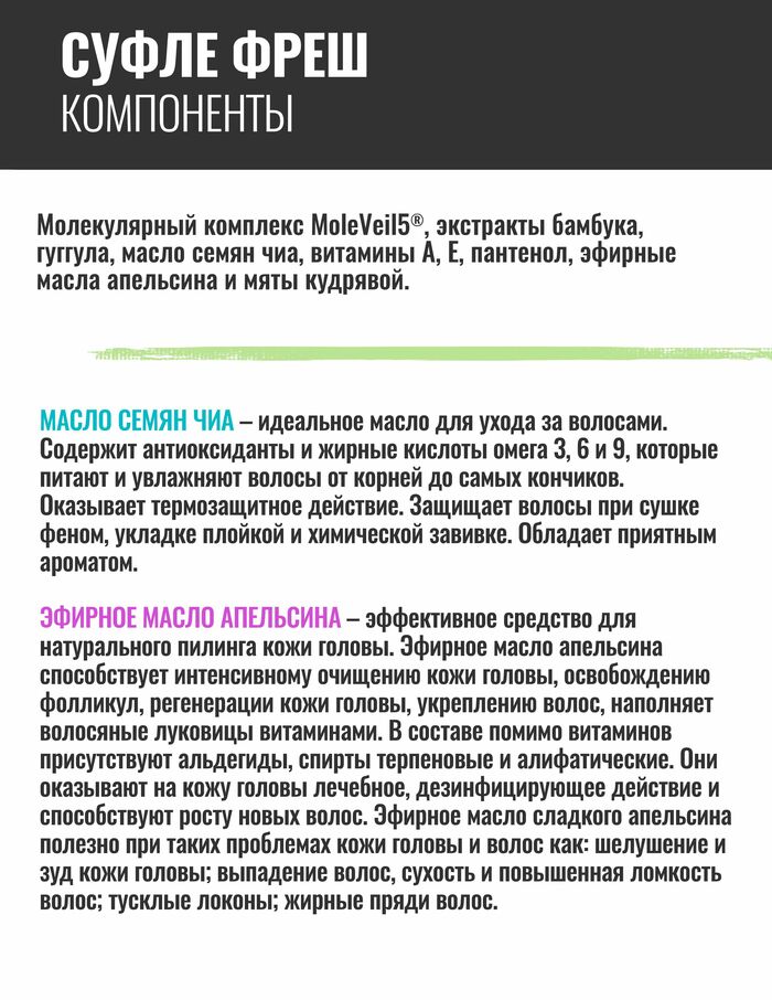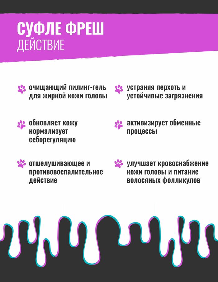 Суфле «Фреш»- интенсивный очищающий молекулярный пилинг-гель для жирной кожи головы.Тщательно очищает кожу головы, устраняя перхоть, устойчивые загрязнения, остатки стайлинговых средств. Оказывает эффективное отшелушивающее и противовоспалительное действие.Молекулярный комплекс улучшает кровоснабжение кожи головы, питает волосяные фолликулы, активизирует рост волос.Комплекс масла семян чиа и витаминов А, Е, пантенол питает корни волос, нормализует водно-жировой баланс.Бамбук и гуггул тонизируют и увлажняют.Эфирное масло сладкого апельсина и мяты кудрявой устраняют излишнюю жирность кожи головы, обеспечивая продолжительное ощущение легкости и комфорта, свежести и чистоты волос.Средство прошло клинические испытания.Если во время эксплуатации у Вас возникли вопросы,мы ответим на них. Суфле «Фреш»-отличный выбор для Ваших волос!