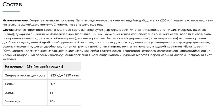 Суп-пюре Proteinrex отличается насыщенным вкусом гороха и грибов, что делает его не только полезным, но и приятным на вкус. Продукт не содержит искусственных добавок и консервантов, что делает его безопасным для ежедневного употребления. Благодаря удобной упаковке, суп легко взять с собой в дорогу или на работу.
