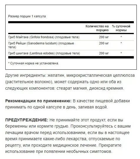 Продукт сочетает лучшие свойства этих грибов, которые традиционно используются в восточной медицине для улучшения здоровья и повышения энергии. Миксы этих грибов помогают поддерживать нормальное функционирование сердечно-сосудистой системы и регулируют уровень сахара в крови. Swanson Triple Mushroom Complex — отличный выбор для тех, кто ищет натуральное средство для укрепления иммунной системы и улучшения общего самочувствия. Добавка подходит для веганов и не содержит искусственных добавок, что делает её безопасной для длительного применения.
