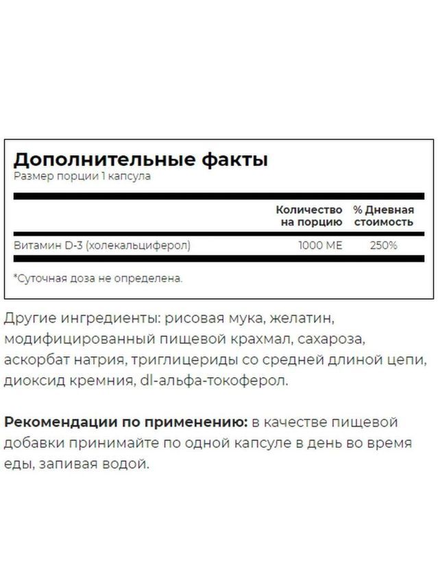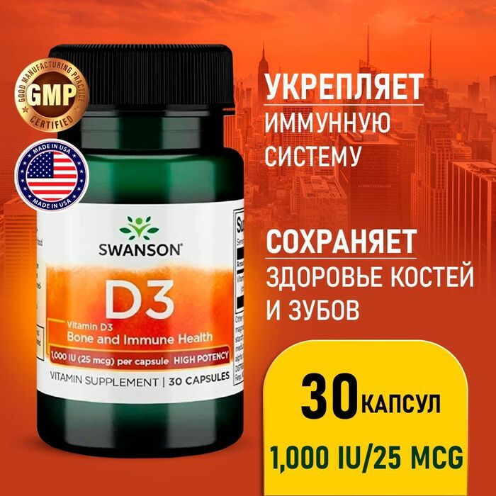 Swanson Витамин Д3 Высокоэффективный представляет собой биологически активную добавку, содержащую 25 мкг (1000 МЕ) витамина D3 в форме холекальциферола в каждой капсуле. Этот продукт разработан для поддержания здоровья костей, иммунной системы и общего благополучия организма. Витамин D3 играет ключевую роль в усвоении кальция и фосфора, что способствует укреплению костной ткани и зубов.