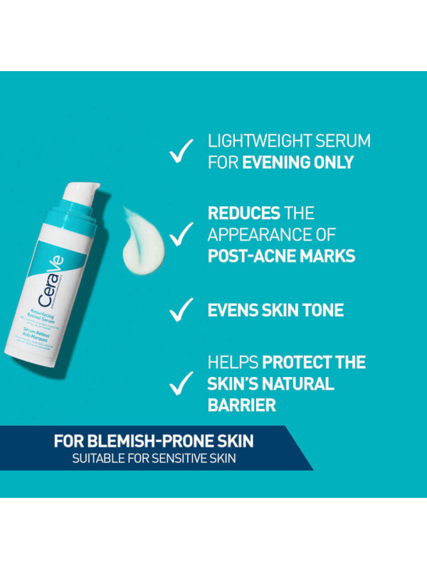 Сыворотка против несовершенств CeraVe Resurfacing Retinol помогает уменьшить следы постакне, выровнять текстуру кожи и сократить видимость пор. Легкая текстура быстро впитывается.