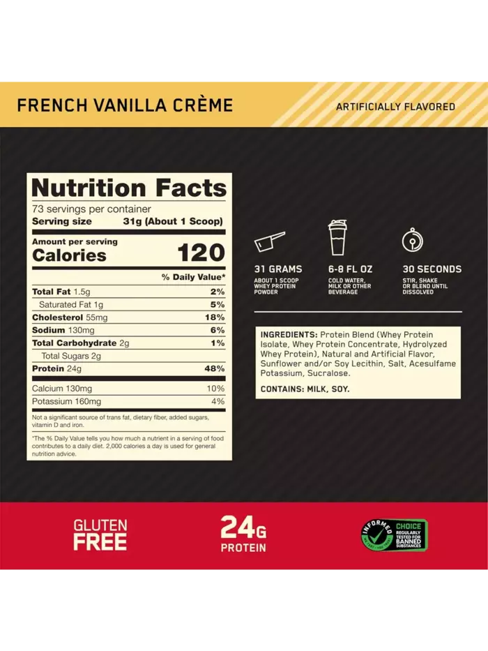 Протеин Gold Standard 100% Whey Ванильный Крем, 2270 г — это высококачественный спортивный продукт, предназначенный для поддержки ваших тренировок и достижения оптимальных результатов. Этот сывороточный протеин содержит 24 г белка на порцию, что способствует восстановлению мышц и их росту. Формула обогащена витаминами и минералами, а также важными аминокислотами, включая BCAA, что делает его идеальным выбором для спортсменов и активных людей.