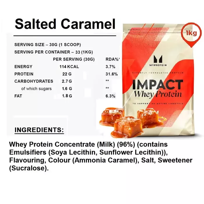 Myprotein Сывороточный протеин Impact Whey Солёная карамель, 1000 г — это высококачественный источник белка, который идеально подходит для поддержки мышечного роста и восстановления после тренировок. Этот продукт сочетает в себе превосходный вкус солёной карамели и эффективную формулу, обеспечивая ваш организм необходимыми аминокислотами для достижения фитнес-целей.