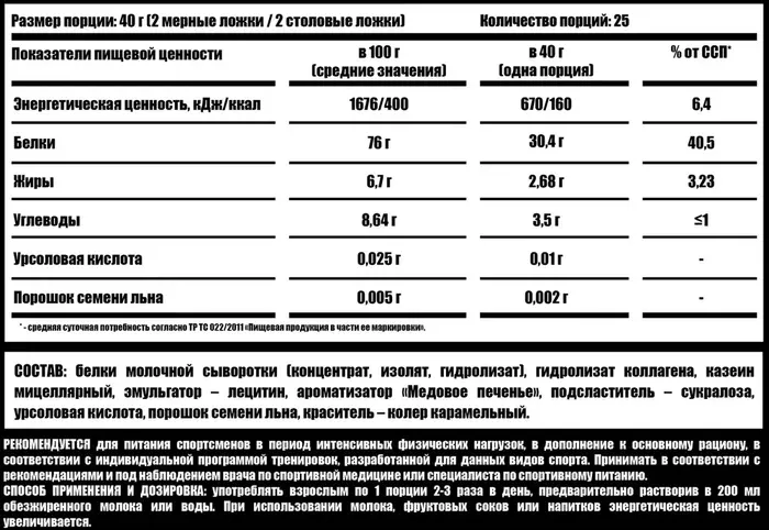 - Вкус медового печенья: Приятный и натуральный вкус делает прием протеина не только полезным, но и приятным.