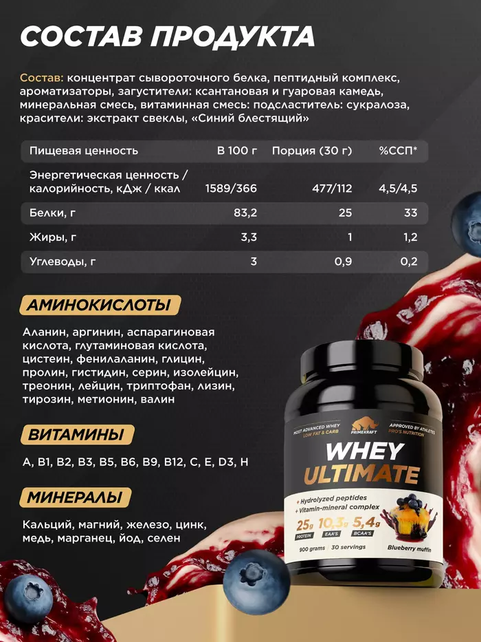 Prime Kraft Сывороточный протеин Whey Ultimate банка Черничный маффин, 900 г — это высококачественный источник белка, специально разработанный для поддержки мышечного роста, восстановления и улучшения спортивных результатов. Этот продукт идеально подходит для спортсменов, фитнес-энтузиастов и всех, кто стремится к здоровому образу жизни.
