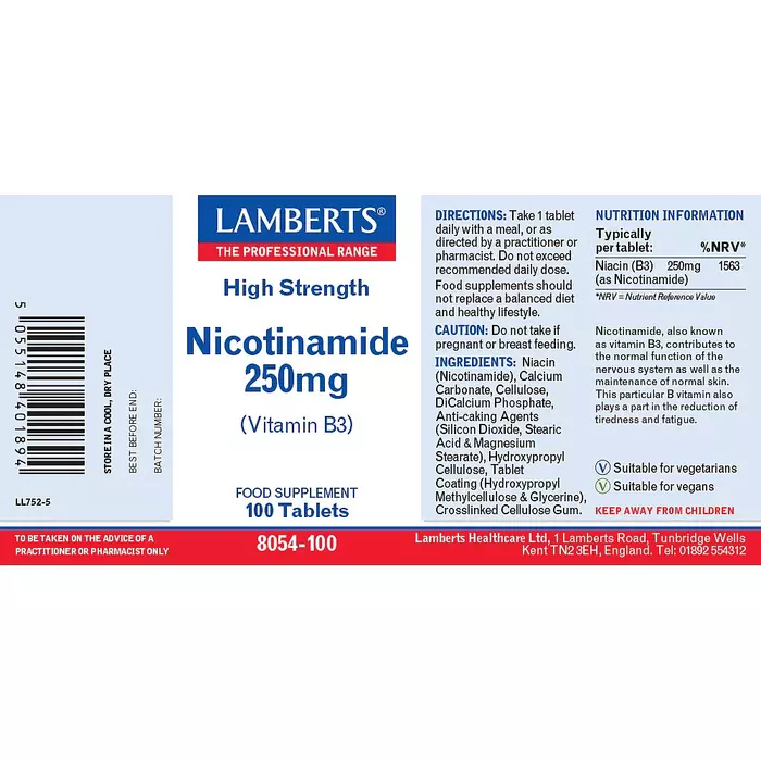 Таблетки Lamberts Nicotinamide 250 мг — это высококачественная добавка, предназначенная для поддержания здоровья и улучшения общего состояния организма. В каждой упаковке содержится 100 таблеток, что обеспечивает длительный курс приема.