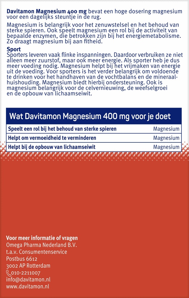 Таблетки магния Davitamon 400 мг — это эффективное средство для поддержания нормального функционирования организма. Каждая таблетка содержит 400 мг магния, который играет важную роль в обмене веществ и поддержании здоровья.