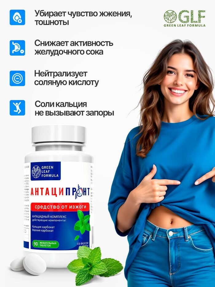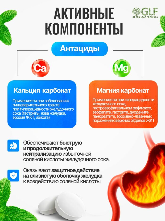 Таблетки имеют удобную форму и быстро растворяются, что делает их идеальными для быстрого применения. Комплекс от бренда GREEN LEAF FORMULA подходит для использования при периодических проблемах с желудком и изжогой, обеспечивая надежную поддержку.