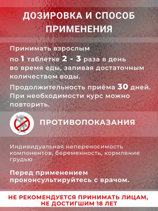 Взрослым принимать по 1 таблетке 2-3 раза в день во время еды, запивая достаточным количеством воды. Продолжительность приема: 30 дней.