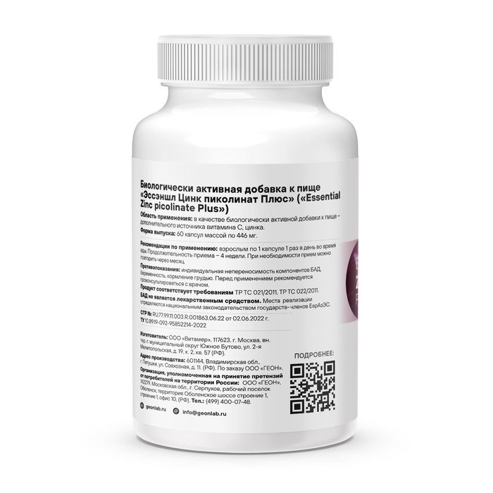 GEON Эссеншл Цинк Пиколинат Плюс - это высококачественный продукт, созданный специально для поддержания здоровья организма. В его составе - микрокристаллическая целлюлоза, L-Аскорбиновая кислота (витамин С) и цинка пиколинат, обеспечивающие организм необходимыми веществами для нормального функционирования.