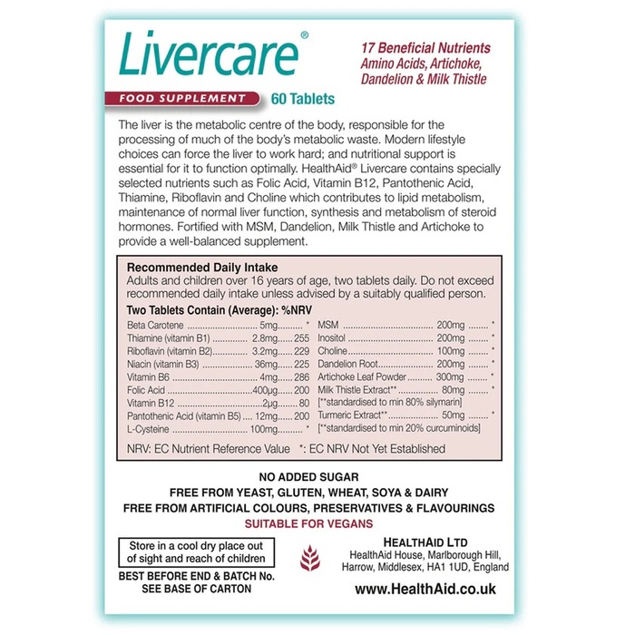 Таблетки Health Aid Livercare имеют вегетарианскую формулу, что делает их подходящими для людей, придерживающихся растительной диеты. Они легко усваиваются и не содержат искусственных добавок.