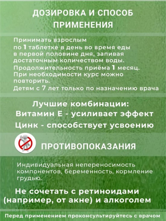 Таблетки легко проглатываются и подходят для ежедневного использования. Рекомендуется принимать их в рамках сбалансированного питания для достижения наилучших результатов.